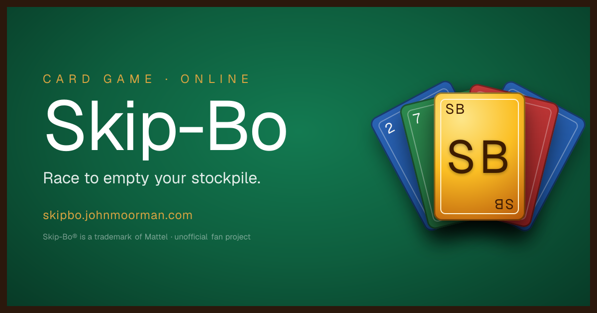 The site is live at skipbo.johnmoorman.com. The free AWS tier lasts through 2026-10-19. After that I'll migrate somewhere cheaper (probably fly.io). Until then, please feel free to hop in and challenge me to a game. Open a room, send me the code, and I'll be there.